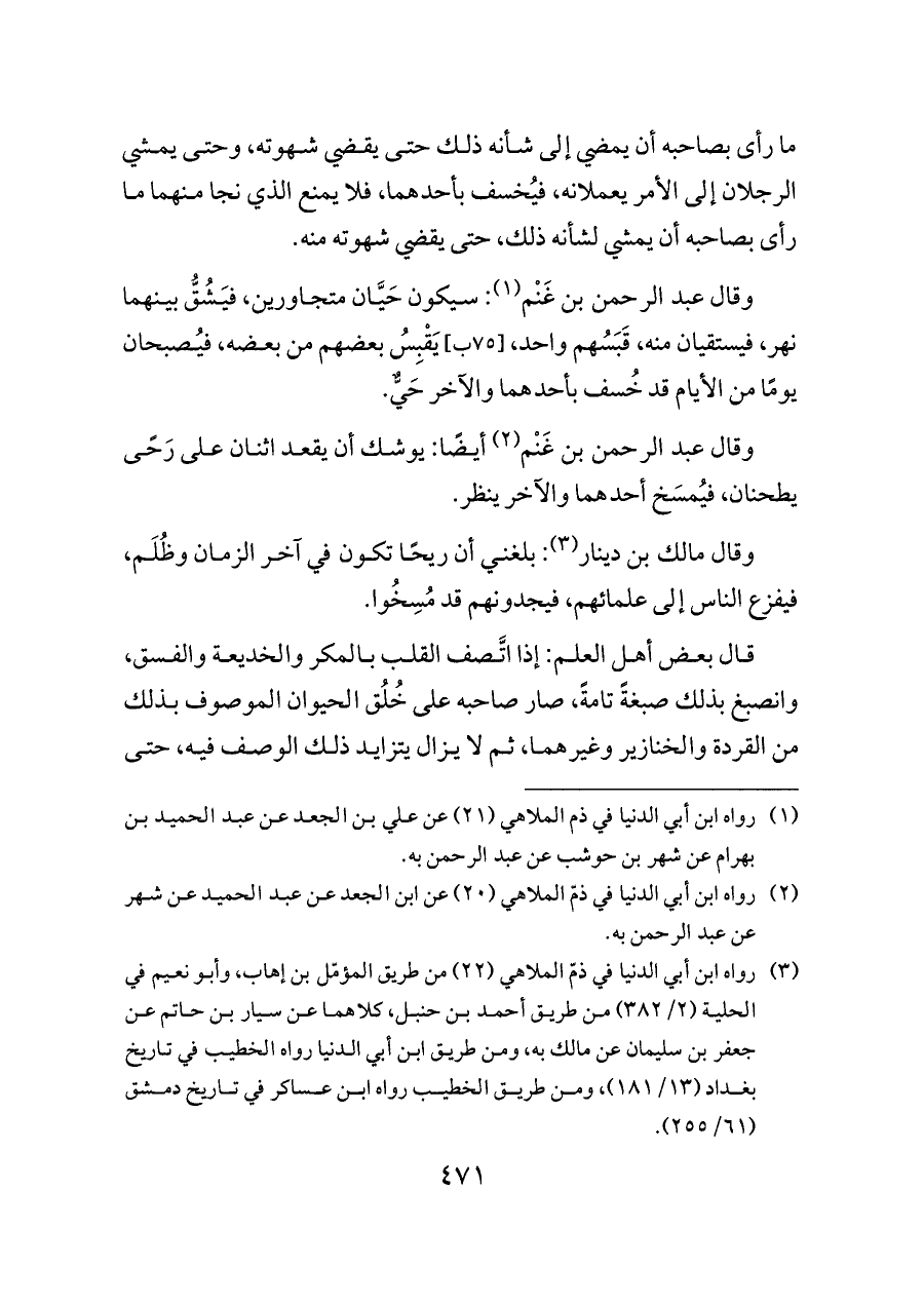 (¬٣) رواه ابن أبي الدنيا في ذمّ الملاهي (٢٢) من طريق المؤمّل بن إهاب، وأبو نعيم في الحلية (٢/ ٣٨٢) من طريق أحمد بن حنبل، كلاهما عن سيار بن حاتم عن جعفر بن سليمان عن مالك به، ومن طريق ابن أبي الدنيا رواه الخطيب في تاريخ بغداد (١٣/ ١٨١)، ومن طريق الخطيب رواه ابن عساكر في تاريخ دمشق (٦١/ ٢٥٥).