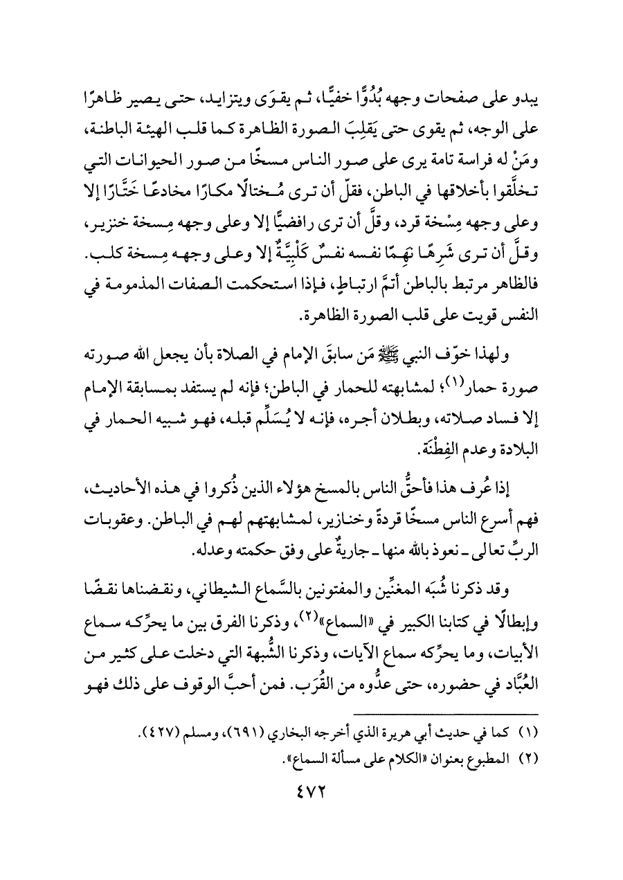 ولهذا خوّف النبي - صلى الله عليه وسلم - مَن سابقَ الإمام في الصلاة بأن يجعل الله صورته صورة حمار (¬١)؛ لمشابهته للحمار في الباطن؛ فإنه لم يستفد بمسابقة الإمام إلا فساد صلاته، وبطلان أجره، فإنه لا يُسَلِّم قبله، فهو شبيه الحمار في البلادة وعدم الفِطْنَة.