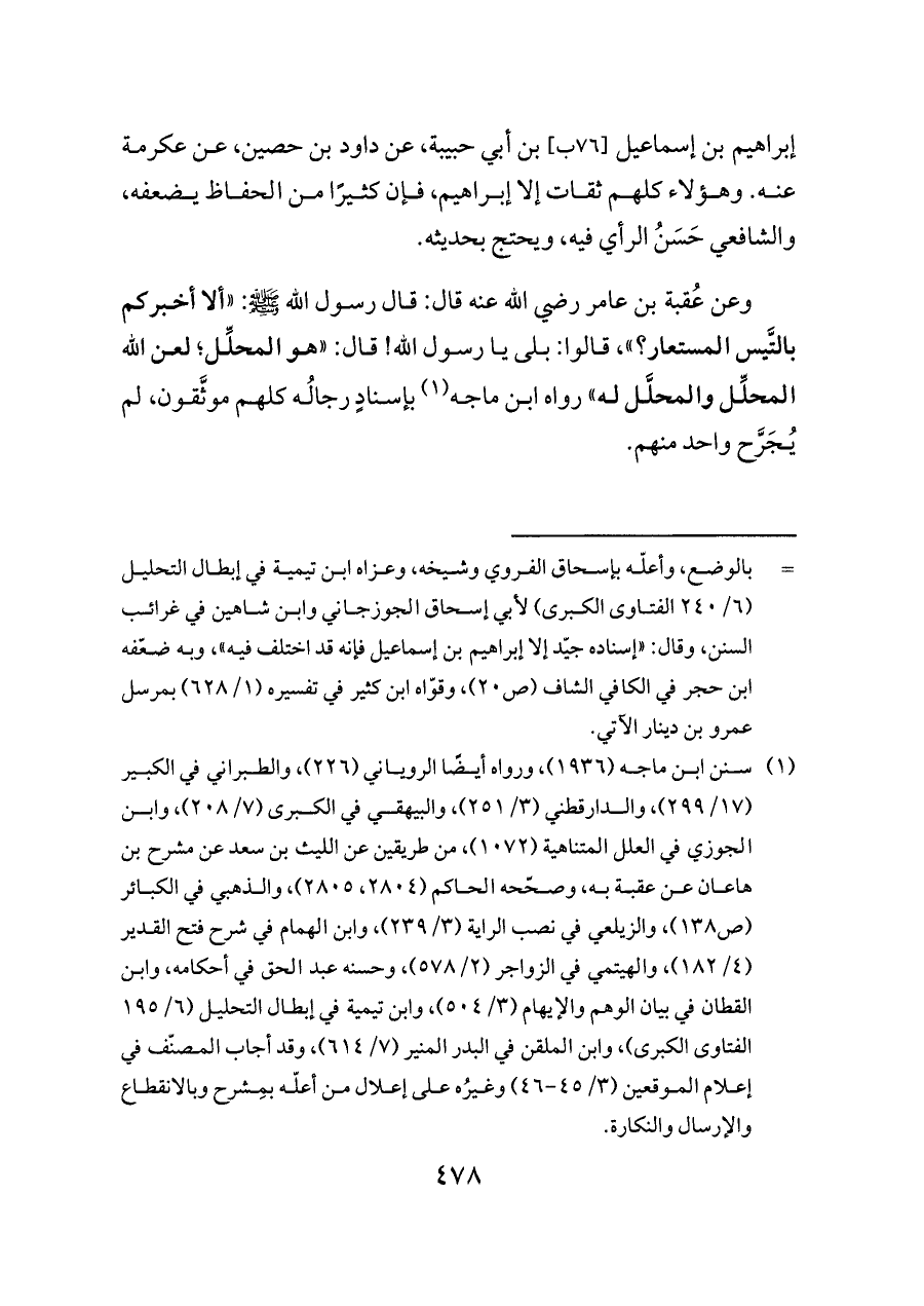 وعن عُقبة بن عامر رضي الله عنه قال: قال رسول الله - صلى الله عليه وسلم -: «ألا أخبركم بالتَّيس المستعار؟»، قالوا: بلى يا رسول الله! قال: «هو المحلِّل؛ لعن الله المحلِّل والمحلَّل له» رواه ابن ماجه (¬١) بإسنادٍ رجالُه كلهم موثَّقون، لم يُجَرَّح واحد منهم.