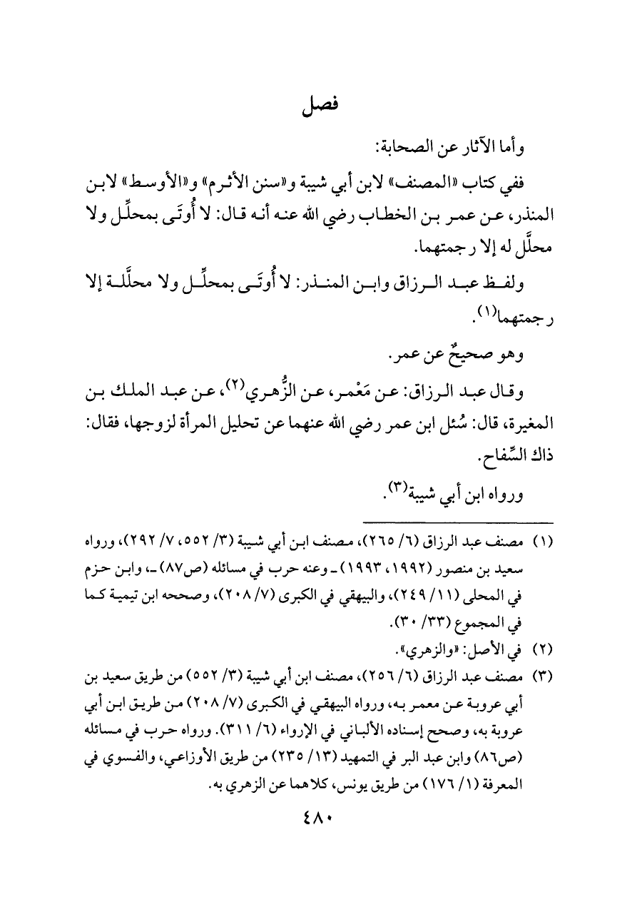 (¬٣) مصنف عبد الرزاق (٦/ ٢٥٦)، مصنف ابن أبي شيبة (٣/ ٥٥٢) من طريق سعيد بن أبي عروبة عن معمر به، ورواه البيهقي في الكبرى (٧/ ٢٠٨) من طريق ابن أبي عروبة به، وصحح إسناده الألباني في الإرواء (٦/ ٣١١). ورواه حرب في مسائله (ص ٨٦) وابن عبد البر في التمهيد (١٣/ ٢٣٥) من طريق الأوزاعي، والفسوي في المعرفة (١/ ١٧٦) من طريق يونس، كلاهما عن الزهري به.