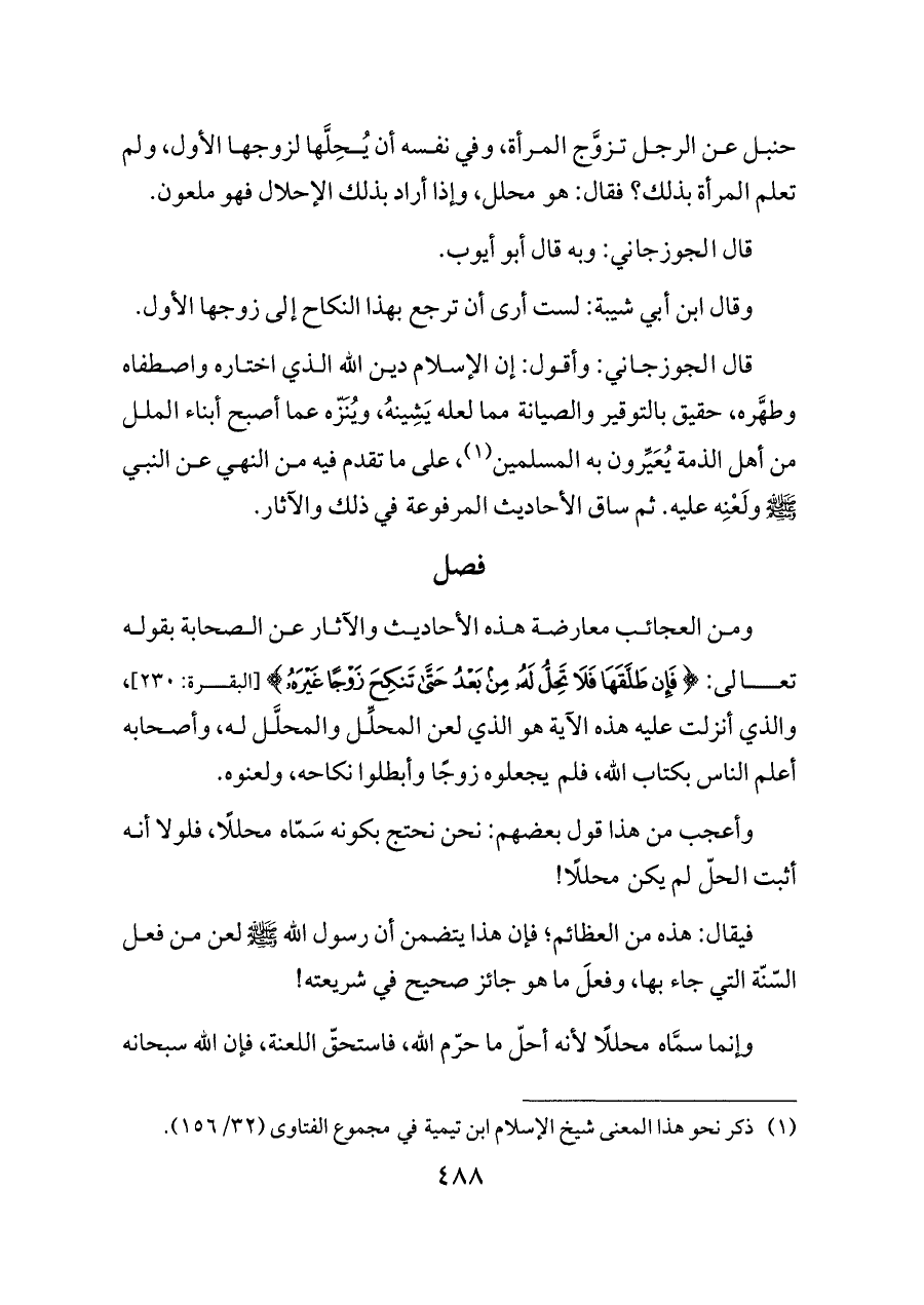 ومن العجائب معارضة هذه الأحاديث والآثار عن الصحابة بقوله تعالى: {فَإِنْ طَلَّقَهَا فَلَا تَحِلُّ لَهُ مِنْ بَعْدُ حَتَّى تَنْكِحَ زَوْجًا غَيْرَهُ} [البقرة: ٢٣٠]،