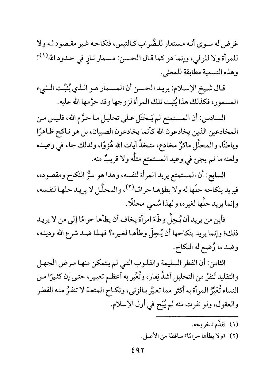 الثامن: أن الفطر السليمة والقلوب التي لم يتمكن منها مرض الجهل والتقليد تَنفرُ من التحليل أشدَّ نِفار، وتُعِّير به أعظم تعيير، حتى إن كثيرًا من النساء تُعَيِّرُ المرأة به أكثر مما تعيِّر بالزنى، ونكاح المتعة لا تنفرُ منه الفطر والعقول، ولو نفرت منه لم يُبَح في أول الإسلام.