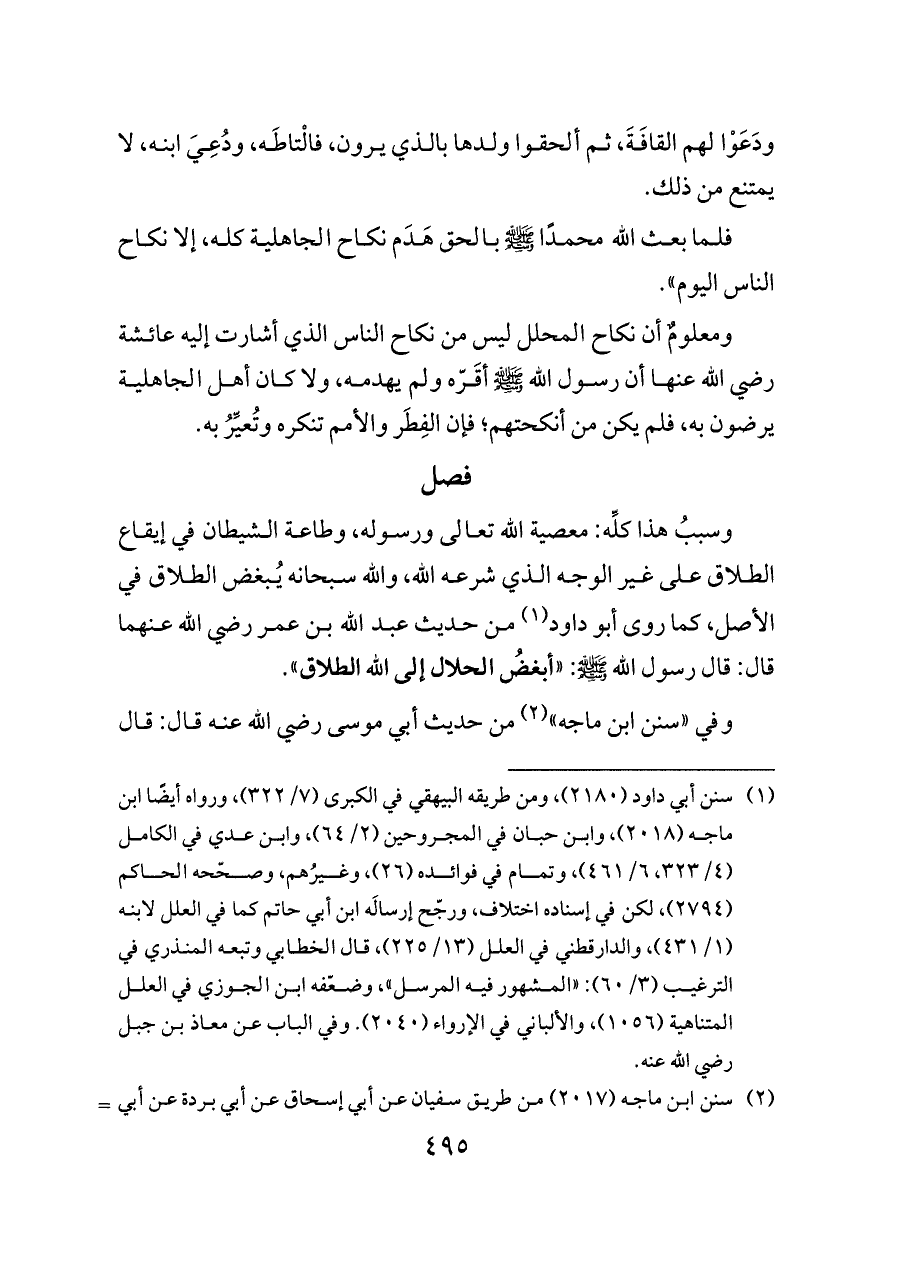 (¬٢) سنن ابن ماجه (٢٠١٧) من طريق سفيان عن أبي إسحاق عن أبي بردة عن أبي موسى به، وبهذا الإسناد رواه البزار (٣١١٧)، والروياني (٤٥٢)، والطبري في تفسيره (٥٢٤٥)، والطحاوي في شرح المشكل (٦/ ٣٢٥)، وابن بطة في إبطال الحيل (ص ٤٠، ٤١)، والبيهقي في الكبرى (٧/ ٣٢٢)، وصححه ابن حبان (٤٢٦٥)، وحسّن إسناده ابن تيمية في إبطال التحليل (٦/ ٢٥٨ الفتاوى الكبرى)، والمصنف فيما يأتي، والبوصيري في المصباح (٢/ ١٢٣)، وضعفه الألباني في السلسلة الضعيفة (٤٤٣١) بعنعنة أبي إسحاق. ورواه الطيالسى (٥٢٧) ــ ومن طريقه البيهقي (٧/ ٣٢٢) ــ عن زهير عن أبي إسحاق به مرسلًا. ورُوِي من طريق يزيد الدالاني عن أبي العلاء الأودي عن حميد بن عبد الرحمن عن أبي موسى بمعناه.