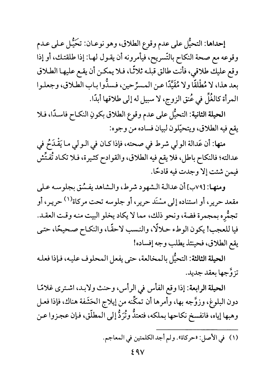 إحداها: التحيُّل على عدم وقوع الطلاق، وهو نوعان: تَحَيُّل على عدم وقوعه مع صحة النكاح بالتّسريح، فيأمرونه أن يقول لها: إذا طلقتك، أو إذا وقع عليك طلاقي، فأنت طالق قبله ثلاثًا، فلا يمكن أن يقع عليها الطلاق بعد هذا، لا مُطْلقًا ولا مُقَيَّدًا عن المسرِّحين، فسدُّوا باب الطلاق، وجعلوا المرأة كالغُلِّ في عُنق الزوج، لا سبيل له إلى طلاقها أبدًا.