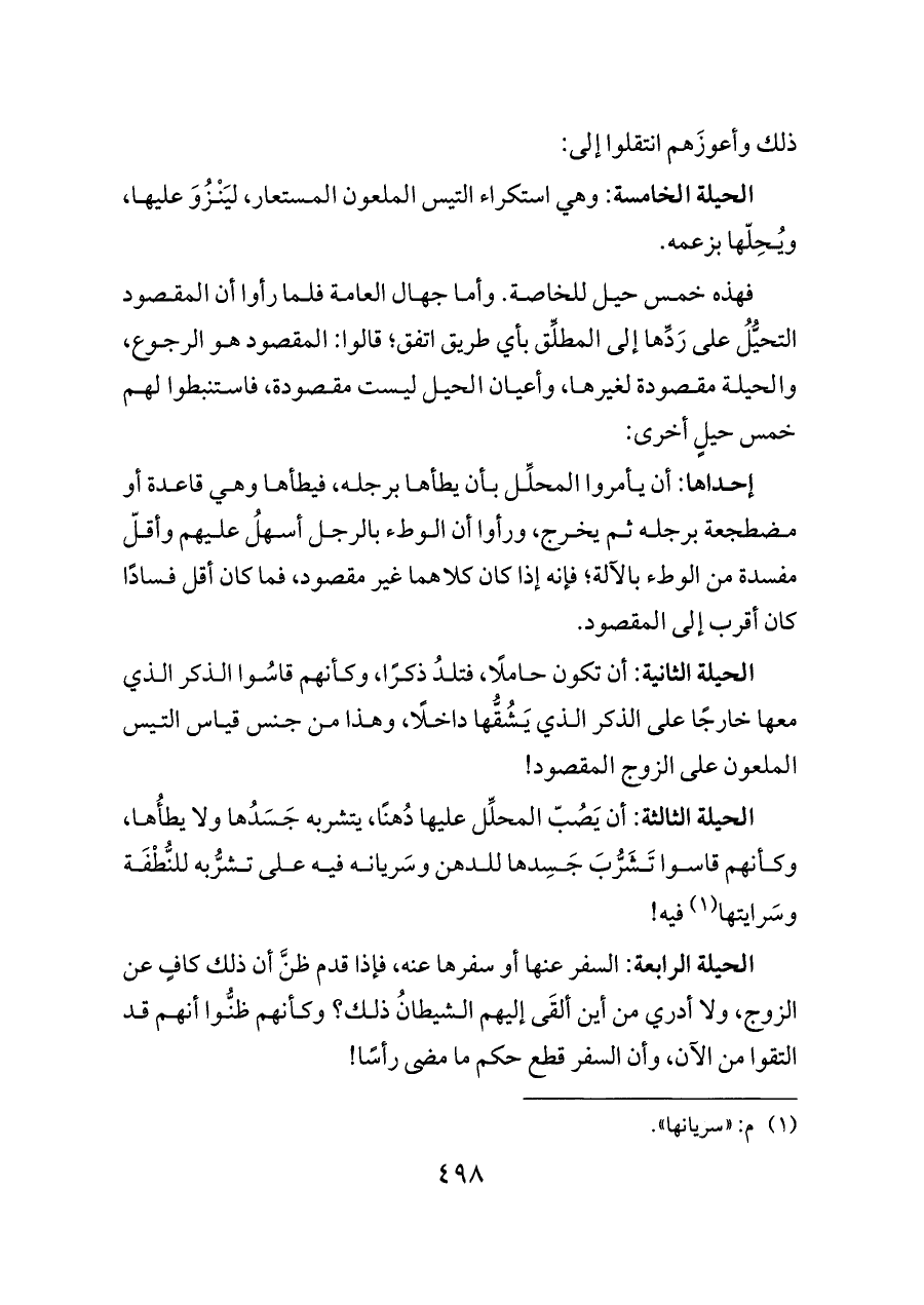 فهذه خمس حيل للخاصة. وأما جهال العامة فلما رأوا أن المقصود التحيُّلُ على رَدِّها إلى المطلِّق بأي طريق اتفق؛ قالوا: المقصود هو الرجوع، والحيلة مقصودة لغيرها، وأعيان الحيل ليست مقصودة، فاستنبطوا لهم خمس حيلٍ أخرى: