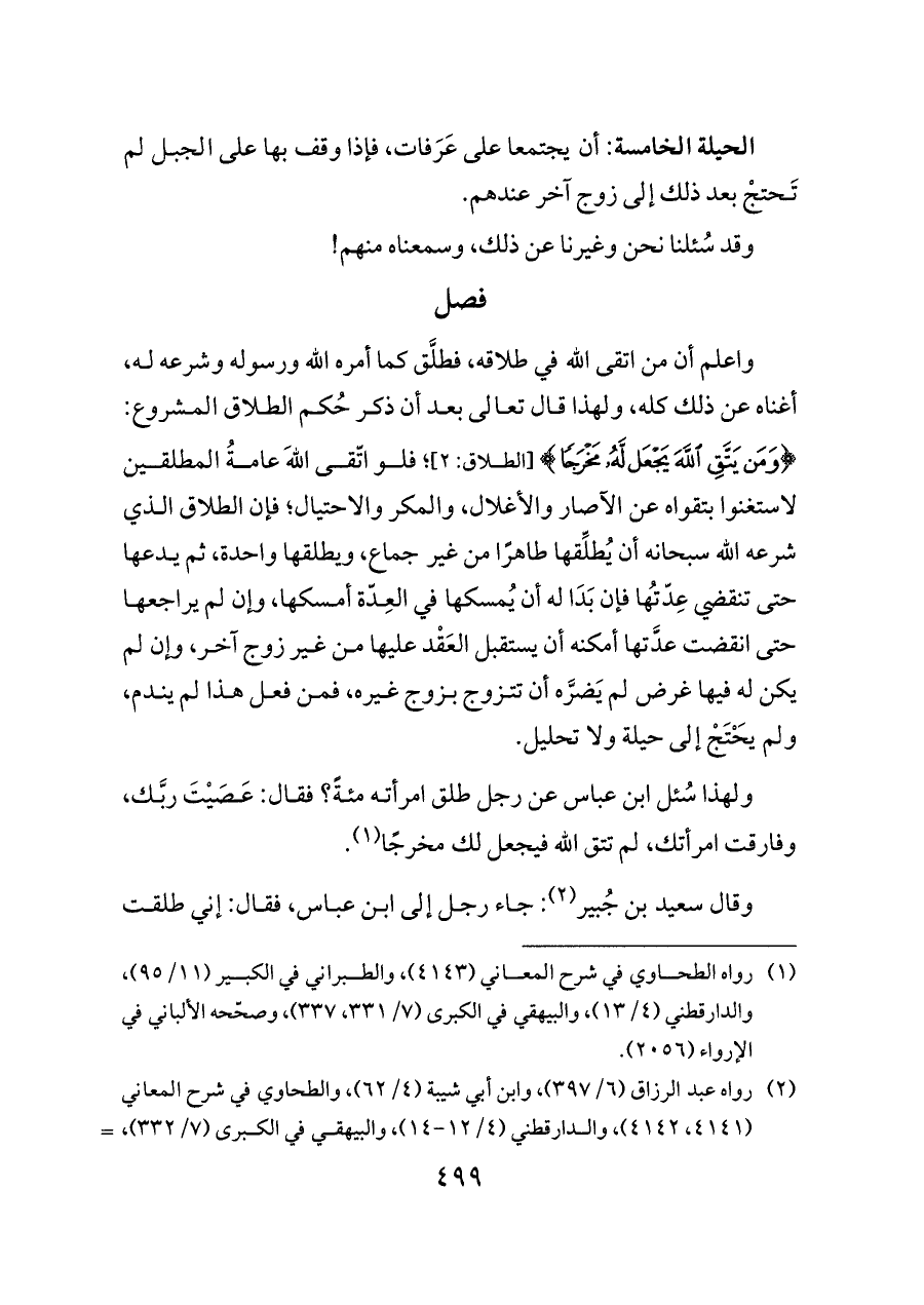 واعلم أن من اتقى الله في طلاقه، فطلَّق كما أمره الله ورسوله وشرعه له، أغناه عن ذلك كله، ولهذا قال تعالى بعد أن ذكر حُكم الطلاق المشروع: {وَمَنْ يَتَّقِ اللَّهَ يَجْعَلْ لَهُ مَخْرَجًا} [الطلاق: ٢]؛ فلو اتّقى اللهَ عامةُ المطلقين لاستغنوا بتقواه عن الآصار والأغلال، والمكر والاحتيال؛ فإن الطلاق الذي شرعه الله سبحانه أن يُطلِّقها طاهرًا من غير جماع، ويطلقها واحدة، ثم يدعها حتى تنقضي عِدّتُها فإن بَدَا له أن يُمسكها في العِدّة أمسكها، وإن لم يراجعها حتى انقضت عدَّتها أمكنه أن يستقبل العَقْد عليها من غير زوج آخر، وإن لم يكن له فيها غرض لم يَضرَّه أن تتزوج بزوج غيره، فمن فعل هذا لم يندم، ولم يَحْتَجْ إلى حيلة ولا تحليل.