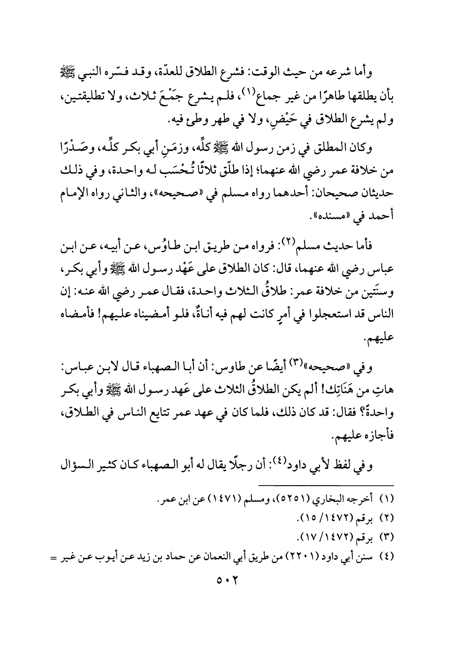 وكان المطلق في زمن رسول الله - صلى الله عليه وسلم - كلِّه، وزمَنِ أبي بكر كلِّه، وصَدْرًا من خلافة عمر رضي الله عنهما؛ إذا طلّق ثلاثًا تُحْسَب له واحدة، وفي ذلك حديثان صحيحان: أحدهما رواه مسلم في «صحيحه»، والثاني رواه الإمام أحمد في «مسنده».