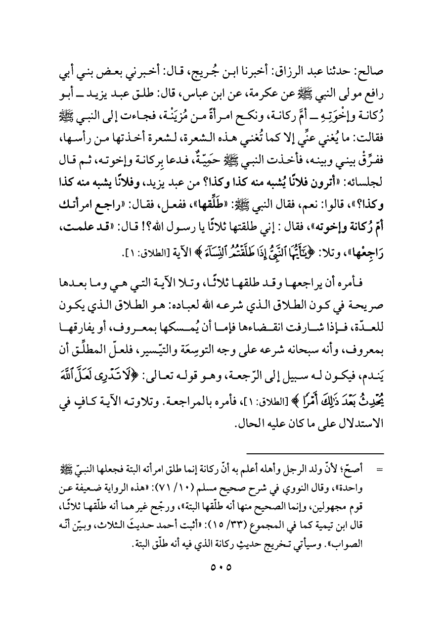 صالح: حدثنا عبد الرزاق: أخبرنا ابن جُريج، قال: أخبرني بعض بني أبي رافع مولى النبي - صلى الله عليه وسلم - عن عكرمة، عن ابن عباس، قال: طلق عبد يزيد ــ أبو رُكانة وإخْوَتِهِ ــ أمَّ ركانة، ونكح امرأةً من مُزيَنْة، فجاءت إلى النبي - صلى الله عليه وسلم - فقالت: ما يُغني عنِّي إلا كما تُغني هذه الشعرة، لشعرة أخذتها من رأسها، ففرِّقْ بيني وبينه، فأخذت النبي - صلى الله عليه وسلم - حَمِيّةٌ، فدعا بِركانة وإخوته، ثم قال لجلسائه: «أترون فلانًا يُشبه منه كذا وكذا؟ من عبد يزيد، وفلانًا يشبه منه كذا وكذا؟»، قالوا: نعم، فقال النبي - صلى الله عليه وسلم -: «طَلِّقها»، ففعل، فقال: «راجع امرأتك أمّ رُكانة وإخوته»، فقال: إني طلقتها ثلاثًا يا رسول الله؟! قال: «قد علمت، رَاجِعْها»، وتلا: {يَاأَيُّهَا النَّبِيُّ إِذَا طَلَّقْتُمُ النِّسَاءَ} الآية [الطلاق: ١].