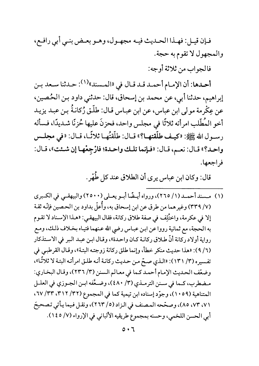 (¬١) مسند أحمد (١/ ٢٦٥)، ورواه أيضًا أبو يعلى (٢٥٠٠) والبيهقي في الكبرى (٧/ ٣٣٩) وغيرهما من طرق عن ابن إسحاق به، وأُعلّ بداود بن الحصين فإنّه ثقة إلا في عكرمة، واختُلِف في صفة طلاق ركانة، فقال البيهقي: «هذا الإسناد لا تقوم به الحجة، مع ثمانية رووا عن ابن عباس رضي الله عنهما فتياه بخلاف ذلك، ومع رواية أولاد ركانة أنّ طلاق ركانة كان واحدة»، وقال ابن عبد البر في الاستذكار (٦/ ٩): «هذا حديث منكر خطأ، وإنما طلق ركانة زوجته البتة»، وقال القرطبي في تفسيره (٣/ ١٣١): «الذي صحّ من حديث ركانة أنه طلق امرأته البتة لا ثلاثًا»، وضعّف الحديث الإمام أحمد كما في معالم السنن (٣/ ٢٣٦)، وقال البخاري: مضطرب، كما في سنن الترمذي (٣/ ٤٨٠)، وضعَّفه ابن الجوزي في العلل المتناهية (١٠٥٩)، وجوّد إسناده ابن تيمية كما في المجموع (٣٢/ ٣١٢، ٣٣/ ٦٧، ٧١، ٧٣، ٨٥)، وصحّحه المصنف في الزاد (٥/ ٢٦٣)، ونقل فيما يأتي تصحيحَ أبي الحسن اللخمي، وحسنه بمجموع طريقيه الألباني في الإرواء (٧/ ١٤٥).
