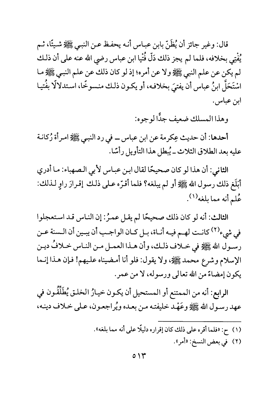 الثالث: أنه لو كان ذلك صحيحًا لم يقل عمرُ: إن الناس قد استعجلوا في شيء (¬٢) كانت لهم فيه أناة، بل كان الواجب أن يبين أن السنة عن رسول الله - صلى الله عليه وسلم - في خلاف ذلك، وأن هذا العمل من الناس خلافُ دين الإسلام وشرع محمد - صلى الله عليه وسلم -، ولا يقول: فلو أنا أمضيناه عليهم! فإن هذا إنما يكون إمضاءً من الله تعالى ورسوله، لا من عمر.