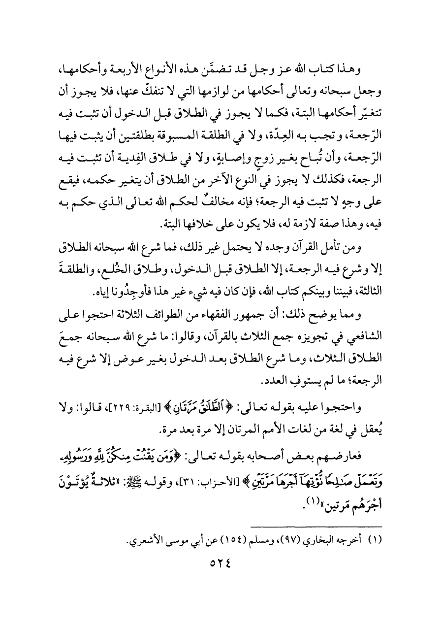 وهذا كتاب الله عز وجل قد تضمَّن هذه الأنواع الأربعة وأحكامها، وجعل سبحانه وتعالى أحكامها من لوازمها التي لا تنفكّ عنها، فلا يجوز أن تتغيّر أحكامها البتة، فكما لا يجوز في الطلاق قبل الدخول أن تثبت فيه الرّجعة، وتجب به العِدّة، ولا في الطلقة المسبوقة بطلقتين أن يثبت فيها الرّجعة، وأن تُباح بغير زوجٍ وإصابةٍ، ولا في طلاق الفِدية أن تثبت فيه الرجعة، فكذلك لا يجوز في النوع الآخر من الطلاق أن يتغير حكمه، فيقع على وجهٍ لا تثبت فيه الرجعة؛ فإنه مخالفٌ لحكم الله تعالى الذي حكم به فيه، وهذا صفة لازمة له، فلا يكون على خلافها البتة.