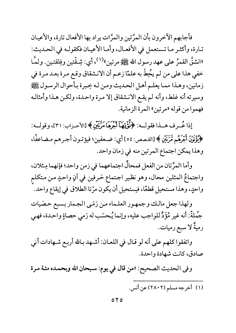 فأجابهم الآخرون بأن المرَّتين والمرَّات يراد بها الأفعال تارة، والأعيان تارة، وأكثر ما تستعمل في الأفعال، وأما الأعيان فكقوله في الحديث: «انشقَّ القمرُ على عهد رسول الله - صلى الله عليه وسلم - مرتين» (¬١)، أي: شِقّتين وفِلقتين. ولمَّا خفي هذا على من لم يُحِطْ به علمًا زعم أن الانشقاق وقع مرة بعد مرة في زمانين، وهذا مما يعلم أهل الحديث ومن له خِبرة بأحوال الرسول - صلى الله عليه وسلم - وسيرته أنه غلط، وأنه لم يقع الانشقاق إلا مرة واحدة، ولكن هذا وأمثاله فهموا من قوله «مرتين» المرة الزمانية.