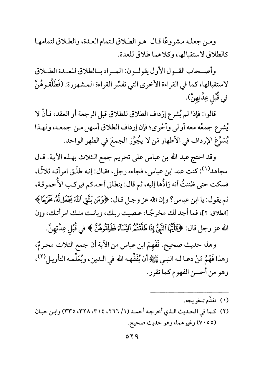 وهذا حديث صحيح. فَفَهِمَ ابن عباس من الآية أن جمع الثلاث محرمٌ، وهذا فَهْمُ مَنْ دعا له النبي -صلى الله عليه وسلم- أن يُفَقِّهه الله في الدين، ويُعَلِّمه التأويل (¬٢)، وهو من أحسن الفهوم كما تقرر.