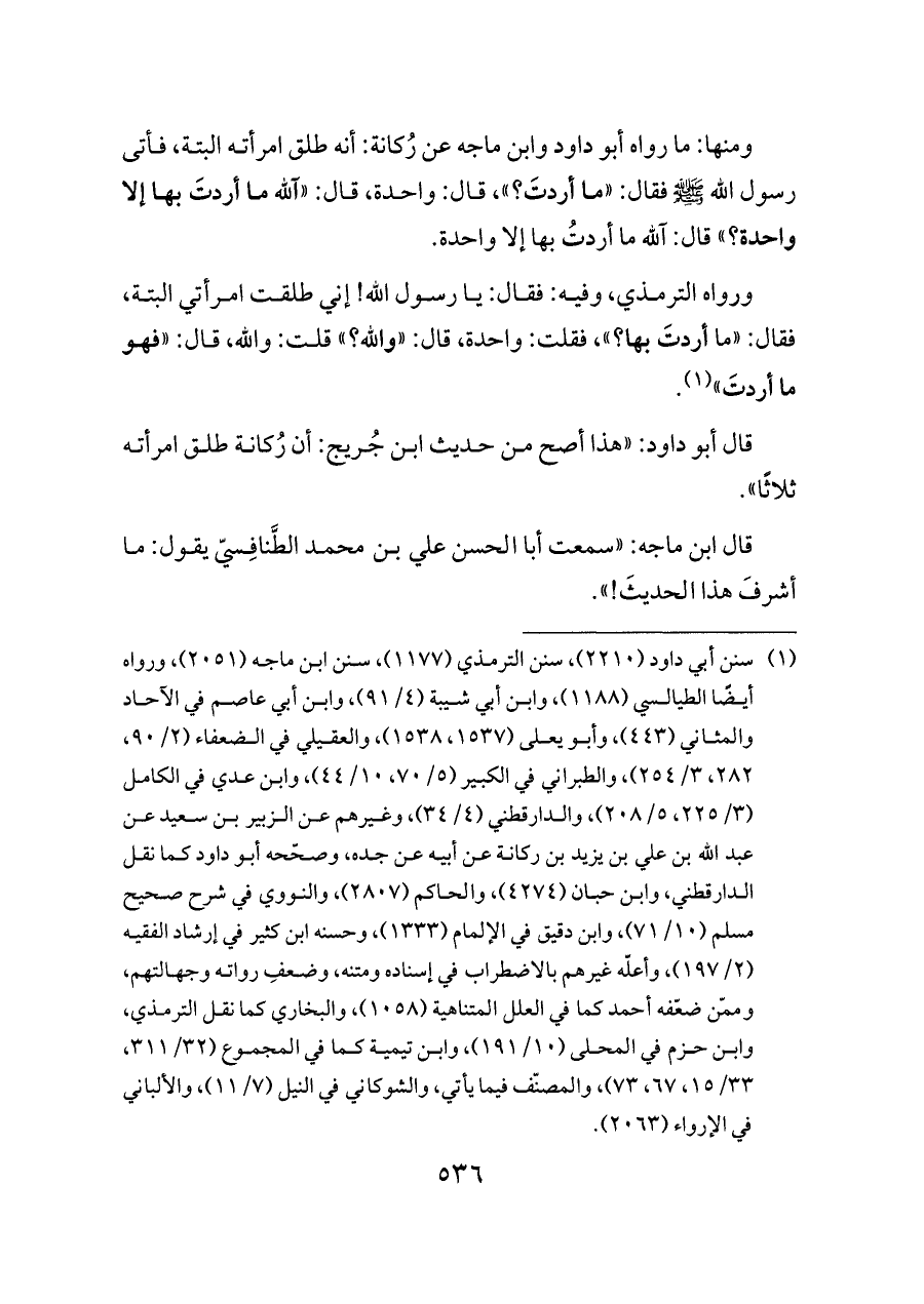 (¬١) سنن أبي داود (٢٢١٠)، سنن الترمذي (١١٧٧)، سنن ابن ماجه (٢٠٥١)، ورواه أيضًا الطيالسي (١١٨٨)، وابن أبي شيبة (٤/ ٩١)، وابن أبي عاصم في الآحاد والمثاني (٤٤٣)، وأبو يعلى (١٥٣٧، ١٥٣٨)، والعقيلي في الضعفاء (٢/ ٩٠، ٢٨٢، ٣/ ٢٥٤)، والطبراني في الكبير (٥/ ٧٠، ١٠/ ٤٤)، وابن عدي في الكامل (٣/ ٢٢٥، ٥/ ٢٠٨)، والدارقطني (٤/ ٣٤)، وغيرهم عن الزبير بن سعيد عن عبد الله بن علي بن يزيد بن ركانة عن أبيه عن جده، وصحّحه أبو داود كما نقل الدارقطني، وابن حبان (٤٢٧٤)، والحاكم (٢٨٠٧)، والنووي في شرح صحيح مسلم (١٠/ ٧١)، وابن دقيق في الإلمام (١٣٣٣)، وحسنه ابن كثير في إرشاد الفقيه (٢/ ١٩٧)، وأعلّه غيرهم بالاضطراب في إسناده ومتنه، وضعفِ رواته وجهالتهم، وممّن ضعّفه أحمد كما في العلل المتناهية (١٠٥٨)، والبخاري كما نقل الترمذي، وابن حزم في المحلى (١٠/ ١٩١)، وابن تيمية كما في المجموع (٣٢/ ٣١١، ٣٣/ ١٥، ٦٧، ٧٣)، والمصنّف فيما يأتي، والشوكاني في النيل (٧/ ١١)، والألباني في الإرواء (٢٠٦٣).