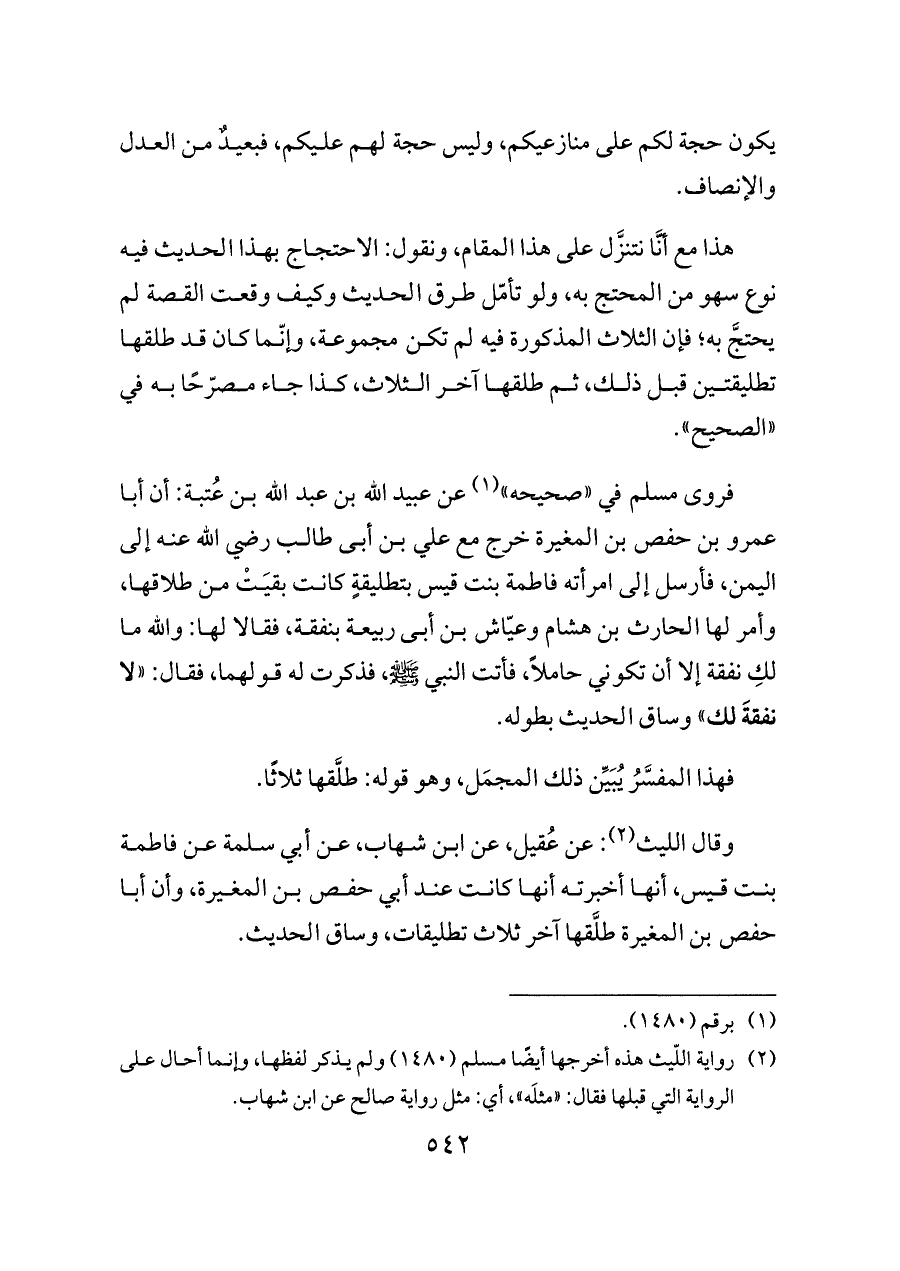 فروى مسلم في «صحيحه» (¬١) عن عبيد الله بن عبد الله بن عُتبة: أن أبا عمرو بن حفص بن المغيرة خرج مع علي بن أبى طالب رضي الله عنه إلى اليمن، فأرسل إلى امرأته فاطمة بنت قيس بتطليقةٍ كانت بقيَتْ من طلاقها، وأمر لها الحارث بن هشام وعيّاش بن أبى ربيعة بنفقة، فقالا لها: والله ما لكِ نفقة إلا أن تكوني حاملاً، فأتت النبي - صلى الله عليه وسلم -، فذكرت له قولهما، فقال: «لا نفقةَ لك» وساق الحديث بطوله.