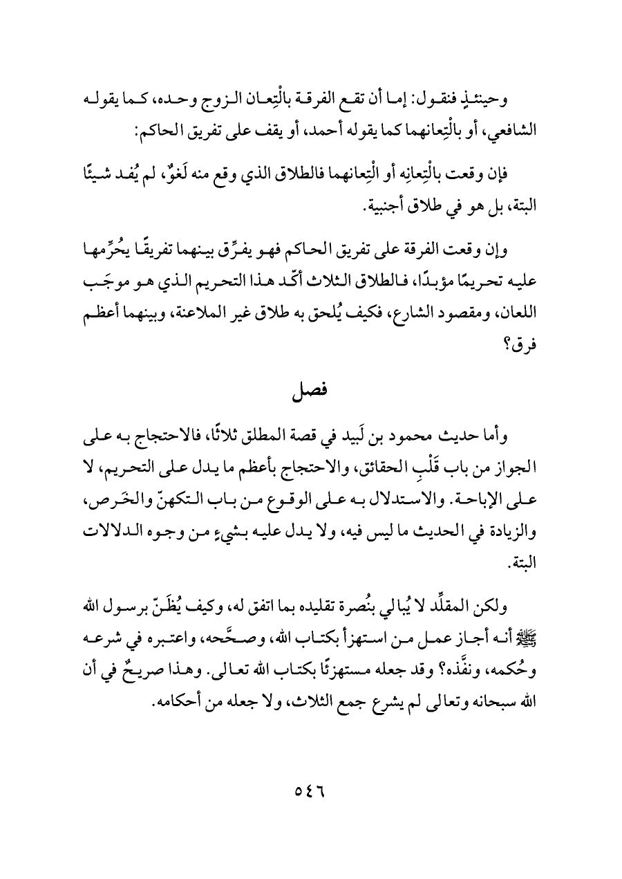 وأما حديث محمود بن لَبيد في قصة المطلق ثلاثًا، فالاحتجاج به على الجواز من باب قَلْبِ الحقائق، والاحتجاج بأعظم ما يدل على التحريم، لا على الإباحة. والاستدلال به على الوقوع من باب التكهنّ والخَرص، والزيادة في الحديث ما ليس فيه، ولا يدل عليه بشيءٍ من وجوه الدلالات البتة.