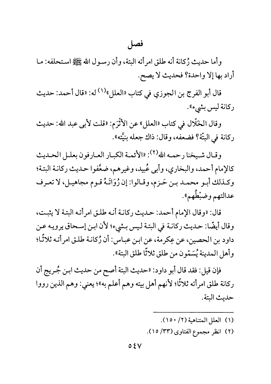 قال: «وقال الإمام أحمد: حديث ركانة أنه طلق امرأته البتة لا يثبت، وقال أيضًا: حديث ركانة في البتة ليس بشيء؛ لأن ابن إسحاق يرويه عن داود بن الحصين، عن عِكرمة، عن ابن عباس: أن رُكانة طلق امرأته ثلاثًا؛ وأهل المدينة يُسَمّون من طلق ثلاثًا طلق البتة».