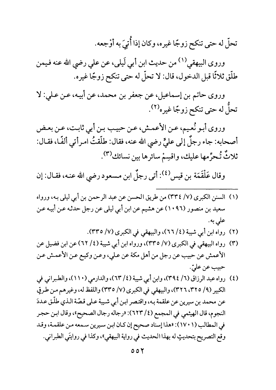 (¬٤) رواه عبد الرزاق (٦/ ٣٩٤)، وابن أبي شيبة (٤/ ٦٣)، والدارمي (١١٠)، والطبراني في الكبير (٩/ ٣٢٥، ٣٢٦)، والبيهقي في الكبرى (٧/ ٣٣٥) واللفظ له، وغيرهم من طرقٍ عن محمد بن سيرين عن علقمة به، واقتصر ابن أبي شيبة على قصّة الذي طلّق عددَ النجوم، قال الهيثمي في المجمع (٤/ ٦٢٣): «رجاله رجال الصحيح»، وقال ابن حجر في المطالب (١٧٠١): «هذا إسناد صحيح إن كان ابن سيرين سمعه من علقمة، وقد وقع التصريح بتحديثٍ له بهذا الحديث في رواية البيهقي»، وكذا في روايتَي الطبراني.