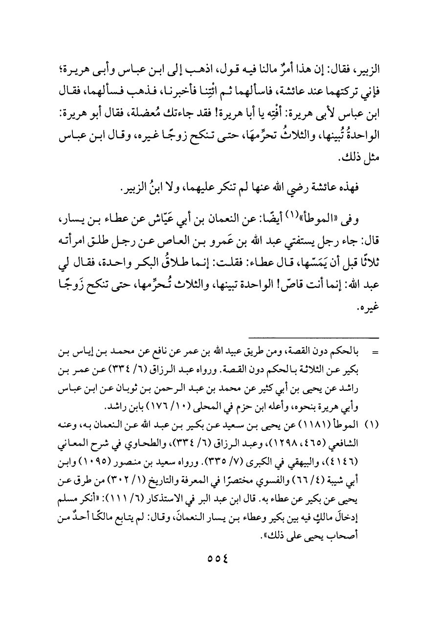 الزبير، فقال: إن هذا أمرٌ مالنا فيه قول، اذهب إلى ابن عباس وأبى هريرة؛ فإني تركتهما عند عائشة، فاسألهما ثم ائْتِنا فأخبرنا، فذهب فسألهما، فقال ابن عباس لأبى هريرة: أفْتِه يا أبا هريرة! فقد جاءتك مُعضلة، فقال أبو هريرة: الواحدةُ تُبينها، والثلاثُ تحرِّمهَا، حتى تنكح زوجًا غيره، وقال ابن عباس مثل ذلك.
