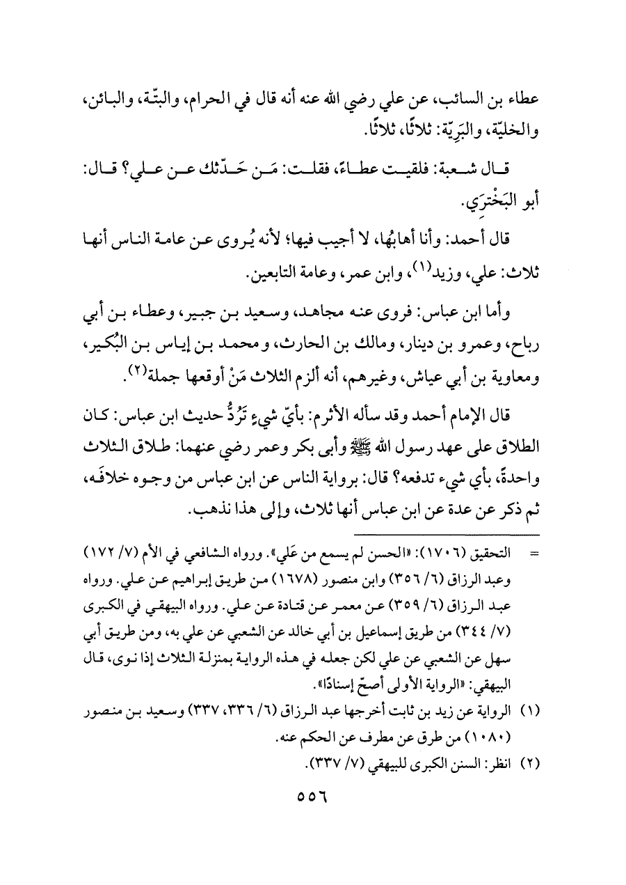قال الإمام أحمد وقد سأله الأثرم: بأيّ شيءٍ تَرُدُّ حديث ابن عباس: كان الطلاق على عهد رسول الله - صلى الله عليه وسلم - وأبى بكر وعمر رضي عنهما: طلاق الثلاث واحدةً، بأي شيء تدفعه؟ قال: برواية الناس عن ابن عباس من وجوه خلافَه، ثم ذكر عن عدة عن ابن عباس أنها ثلاث، وإلى هذا نذهب.