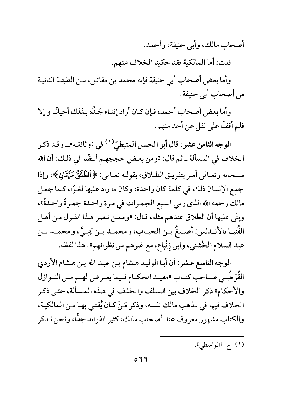 الوجه التاسع عشر: أن أبا الوليد هشام بن عبد الله بن هشام الأزدي القُرْطُبي صاحب كتاب «مفيد الحكام فيما يعرض لهم من النوازل والأحكام» ذكر الخلاف بين السلف والخلف في هذه المسألة، حتى ذكر الخلاف فيها في مذهب مالك نفسه، وذكر مَنْ كان يُفتي بها من المالكية، والكتاب مشهور معروف عند أصحاب مالك، كثير الفوائد جدًّا، ونحن نذكر