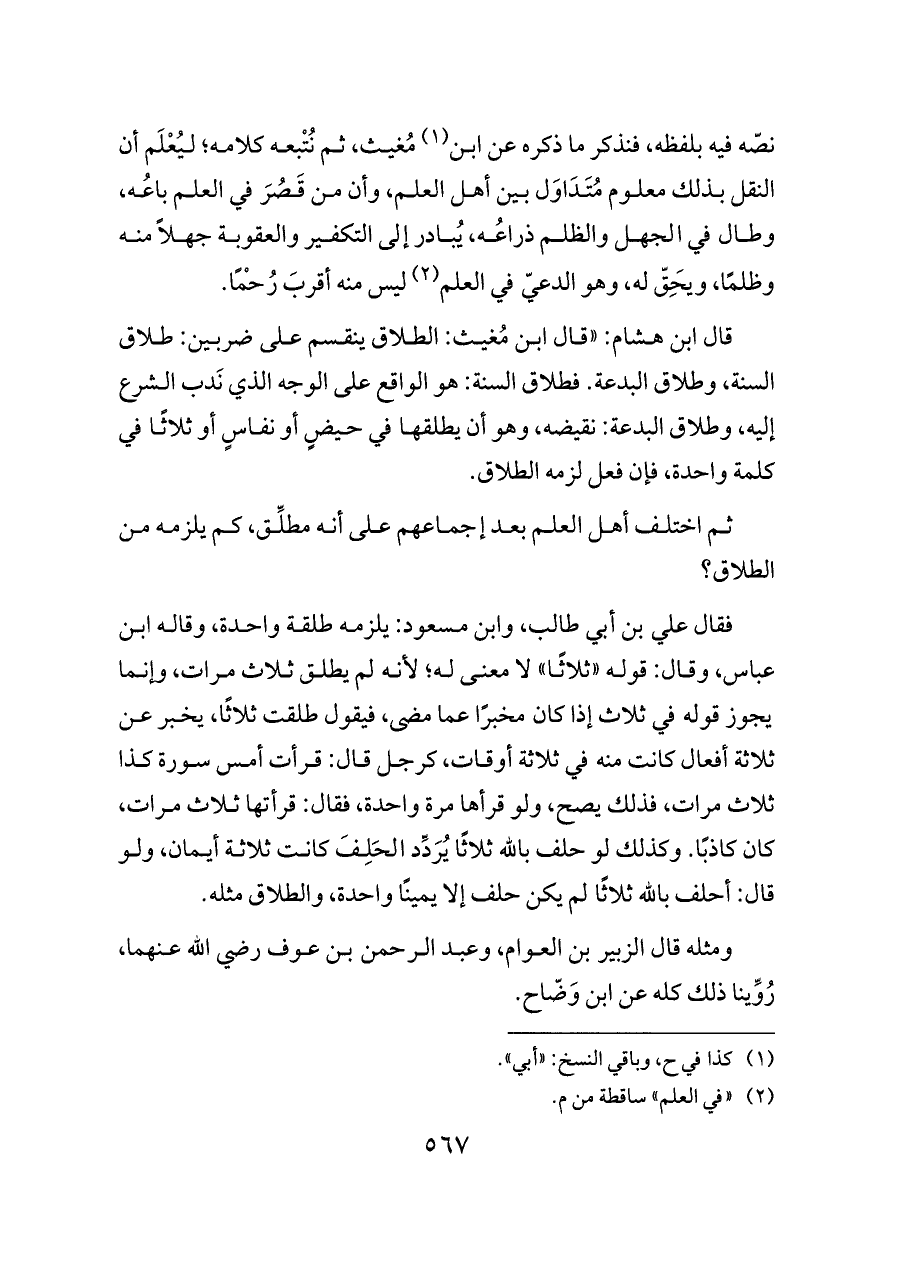 قال ابن هشام: «قال ابن مُغيث: الطلاق ينقسم على ضربين: طلاق السنة، وطلاق البدعة. فطلاق السنة: هو الواقع على الوجه الذي نَدب الشرع إليه، وطلاق البدعة: نقيضه، وهو أن يطلقها في حيضٍ أو نفاسٍ أو ثلاثًا في كلمة واحدة، فإن فعل لزمه الطلاق.