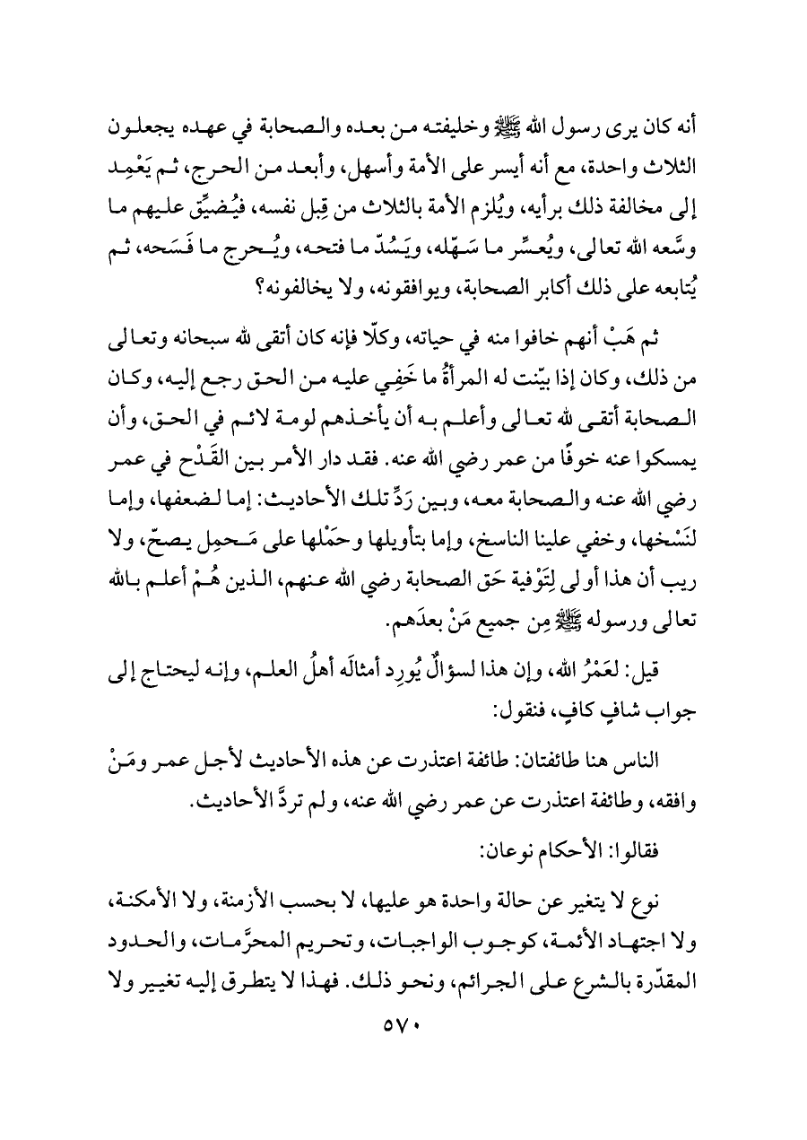 أنه كان يرى رسول الله - صلى الله عليه وسلم - وخليفته من بعده والصحابة في عهده يجعلون الثلاث واحدة، مع أنه أيسر على الأمة وأسهل، وأبعد من الحرج، ثم يَعْمِد إلى مخالفة ذلك برأيه، ويُلزم الأمة بالثلاث من قِبل نفسه، فيُضيِّق عليهم ما وسَّعه الله تعالى، ويُعسِّر ما سَهّله، ويَسُدّ ما فتحه، ويُحرج ما فَسَحه، ثم يُتابعه على ذلك أكابر الصحابة، ويوافقونه، ولا يخالفونه؟