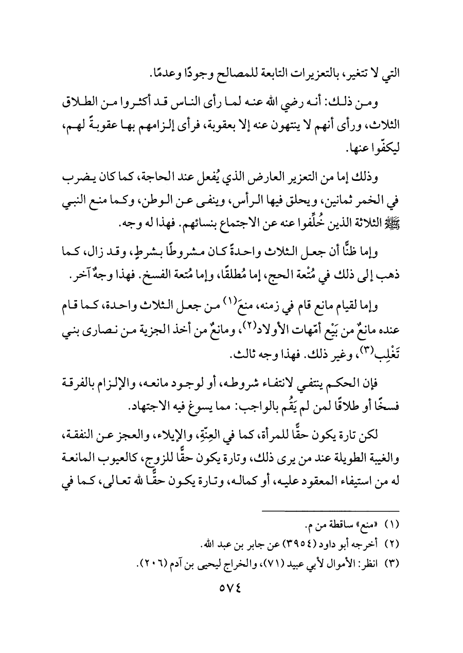 وإما لقيام مانع قام في زمنه، منعَ (¬١) من جعل الثلاث واحدة، كما قام عنده مانعٌ من بَيْع أمّهات الأولاد (¬٢)، ومانعٌ من أخذ الجزية من نصارى بني تَغْلِب (¬٣)، وغير ذلك. فهذا وجه ثالث.