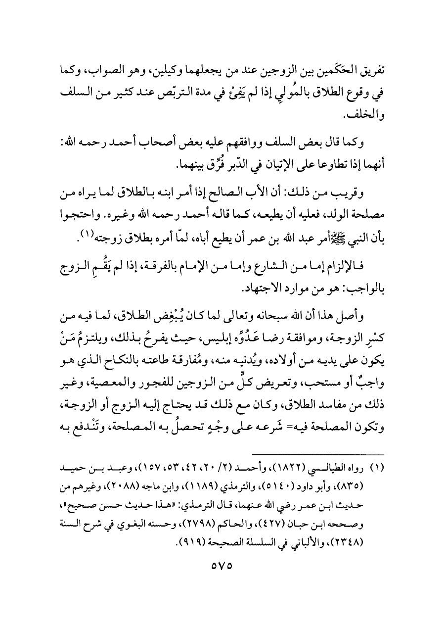 وقريب من ذلك: أن الأب الصالح إذا أمر ابنه بالطلاق لما يراه من مصلحة الولد، فعليه أن يطيعه، كما قاله أحمد رحمه الله وغيره. واحتجوا بأن النبي - صلى الله عليه وسلم - أمر عبد الله بن عمر أن يطيع أباه، لمّا أمره بطلاق زوجته (¬١).