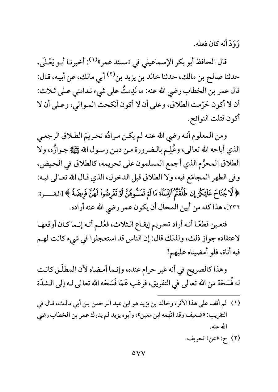 قال الحافظ أبو بكر الإسماعيلي في «مسند عمر» (¬١): أخبرنا أبو يَعْلَى، حدثنا صالح بن مالك، حدثنا خالد بن يزيد بن (¬٢) أبي مالك، عن أبيه، قال: قال عمر بن الخطاب رضي الله عنه: ما نَدِمتُ على شيء ندامتي على ثلاث: أن لا أكون حَرّمت الطلاق، وعلى أن لا أكون أنكحت الموالي، وعلى أن لا أكون قتلت النوائح.