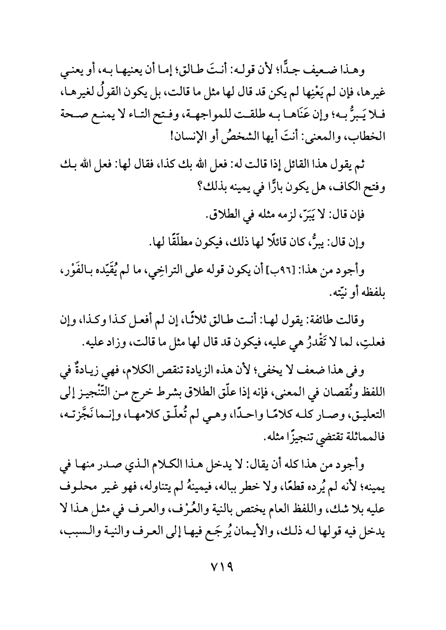 وأجود من هذا كله أن يقال: لا يدخل هذا الكلام الذي صدر منها في يمينه؛ لأنه لم يُرده قطعًا، ولا خطر بباله، فيمينهُ لم يتناوله، فهو غير محلوف عليه بلا شك، واللفظ العام يختص بالنية والعُرْف، والعرف في مثل هذا لا يدخل فيه قولها له ذلك، والأيمان يُرجَع فيها إلى العرف والنية والسبب،