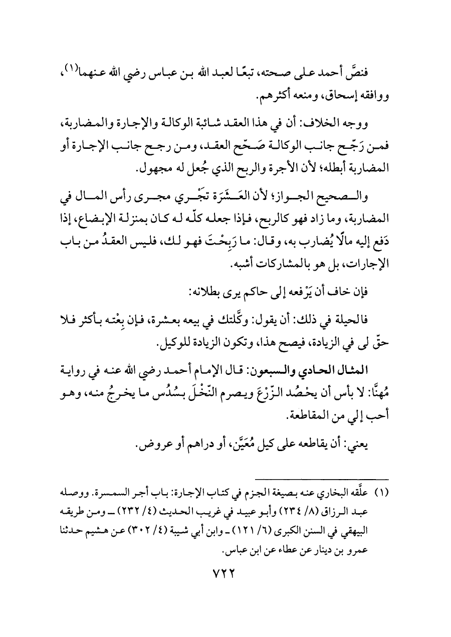 المثال الحادي والسبعون: قال الإمام أحمد رضي الله عنه في رواية مُهنَّا: لا بأس أن يحْصُد الزّرْعَ ويصرم النّخْلَ بسُدُس ما يخرجُ منه، وهو أحب إلي من المقاطعة.