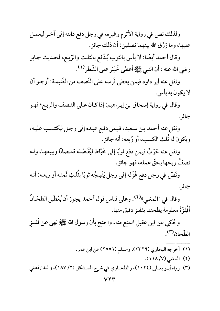 وقال أحمد أيضًا: لا بأس بالثوب يُدْفع بالثلث والرّبع، لحديث جابر رضي الله عنه: أن النبي - صلى الله عليه وسلم - أعطى خَيْبَر على الشّطر (¬١).