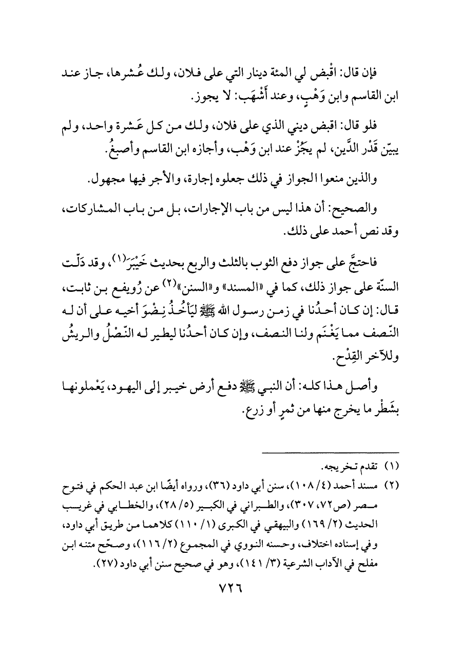 فاحتجَّ على جواز دفع الثوب بالثلث والربع بحديث خَيْبَرَ (¬١)، وقد دَلّت السنّة على جواز ذلك، كما في «المسند» و «السنن» (¬٢) عن رُويفع بن ثابت، قال: إن كان أحدُنا في زمن رسول الله - صلى الله عليه وسلم - ليَأخُذُ نِضْوَ أخيه على أن له النّصف مما يَغْنَم ولنا النصف، وإن كان أحدُنا ليطير له النّصْلُ والريشُ وللآخر القِدْح.