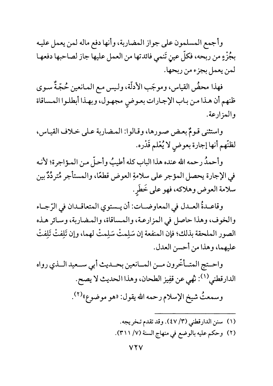 فهذا محضُ القياس، وموجَب الأدلّة، وليس مع المانعين حُجّةٌ سوى ظنهم أن هذا من باب الإجارات بعوضٍ مجهول، وبهذا أبطلوا المساقاة والمزارعة.