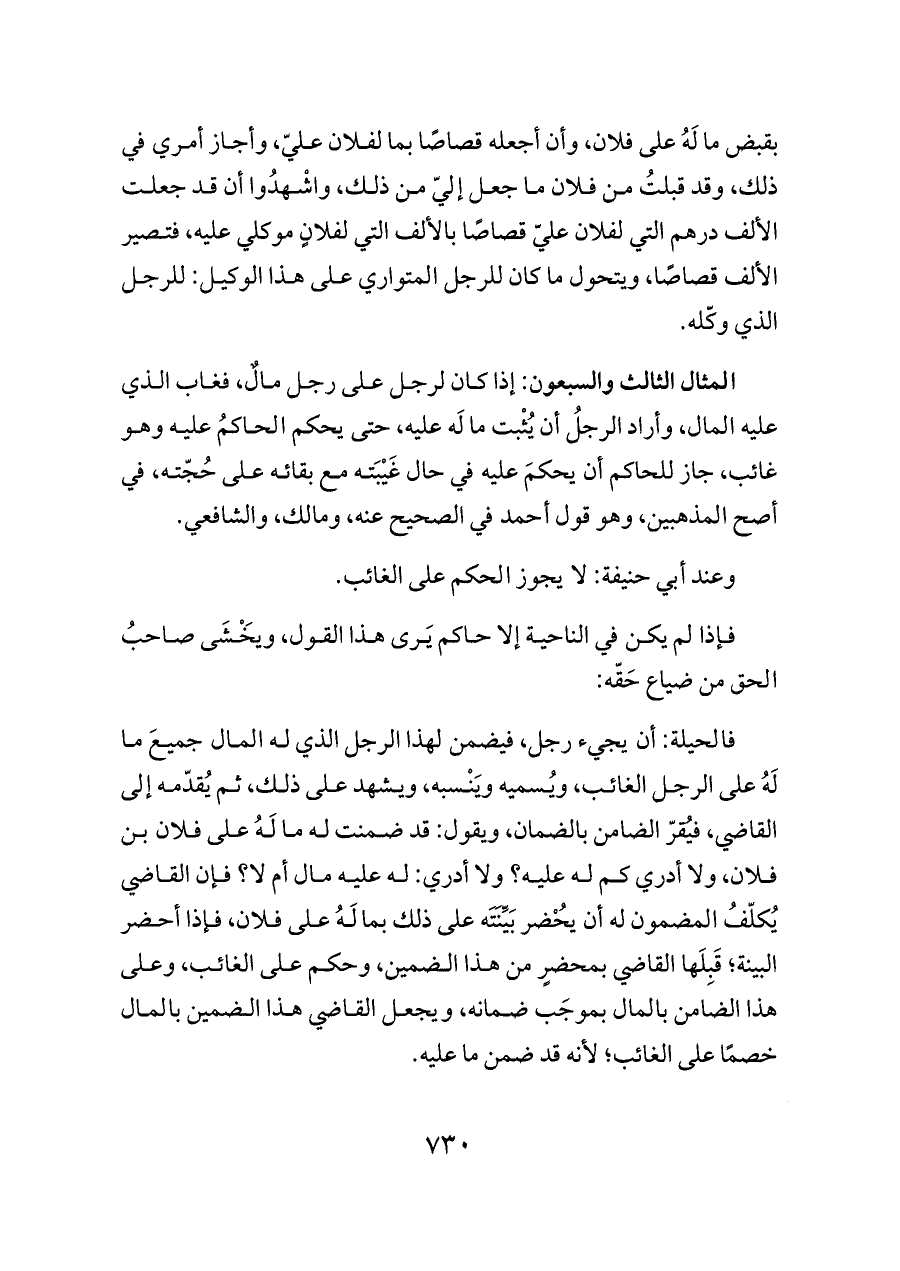 المثال الثالث والسبعون: إذا كان لرجل على رجل مالٌ، فغاب الذي عليه المال، وأراد الرجلُ أن يُثْبت ما لَه عليه، حتى يحكم الحاكمُ عليه وهو غائب، جاز للحاكم أن يحكمَ عليه في حال غَيْبَته مع بقائه على حُجّته، في أصح المذهبين، وهو قول أحمد في الصحيح عنه، ومالك، والشافعي.