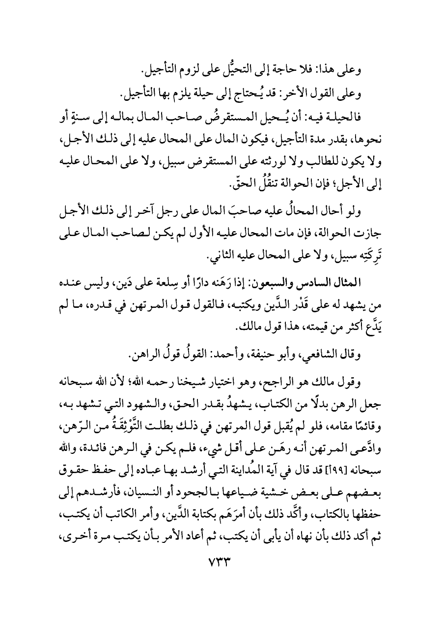 وقول مالك هو الراجح، وهو اختيار شيخنا رحمه الله؛ لأن الله سبحانه جعل الرهن بدلًا من الكتاب، يشهدُ بقدر الحق، والشهود التي تشهد به، وقائمًا مقامه، فلو لم يُقبل قول المرتهن في ذلك بطلت التَّوْثِقَةُ من الرّهن، وادَّعى المرتهن أنه رهَن على أقل شيء، فلم يكن في الرهن فائدة، والله سبحانه [٩٩ أ] قد قال في آية المُداينة التي أرشد بها عباده إلى حفظ حقوق بعضهم على بعض خشية ضياعها بالجحود أو النسيان، فأرشدهم إلى حفظها بالكتاب، وأكَّد ذلك بأن أمرَهَم بكتابة الدَّين، وأمر الكاتب أن يكتب، ثم أكد ذلك بأن نهاه أن يأبى أن يكتب، ثم أعاد الأمر بأن يكتب مرة أخرى،
