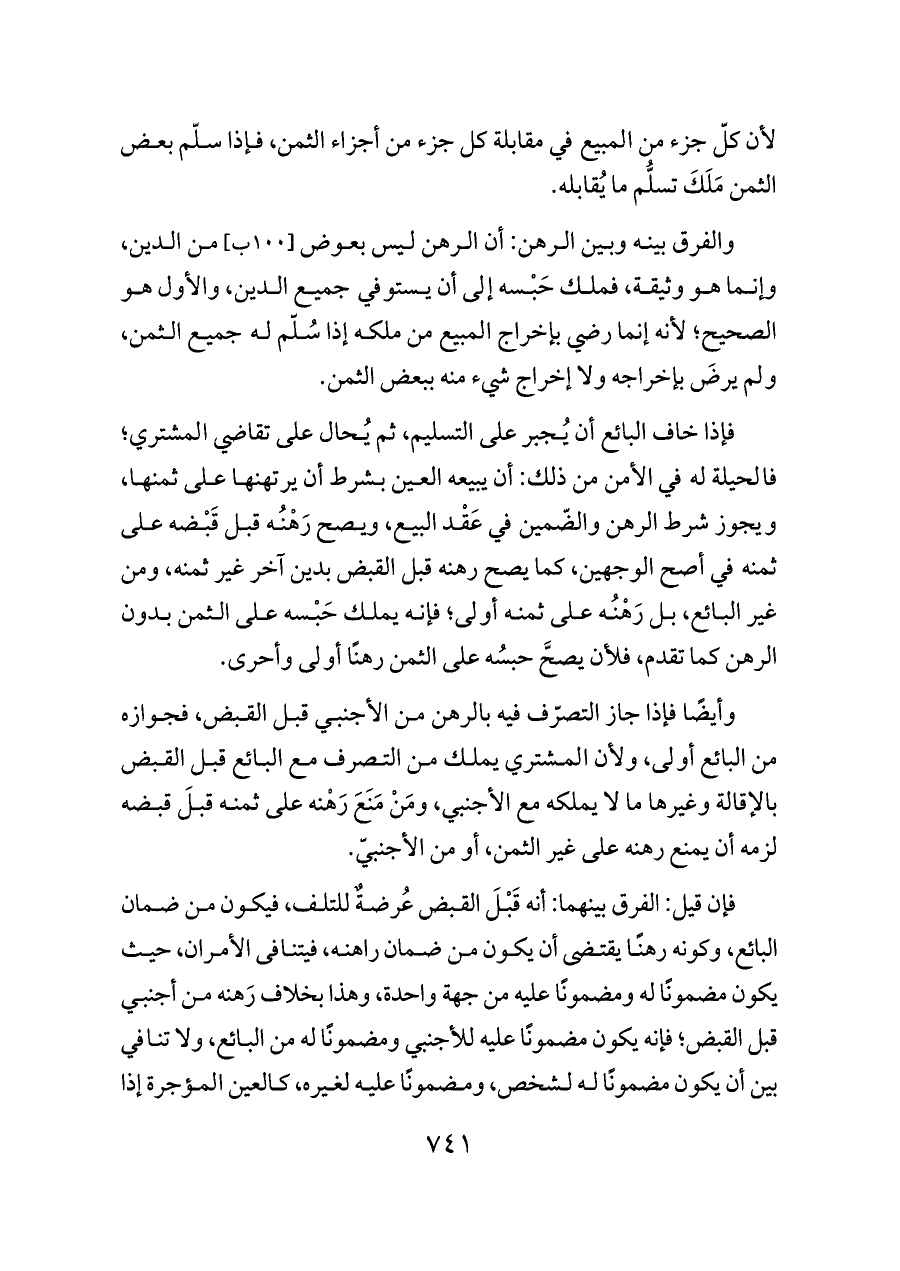 والفرق بينه وبين الرهن: أن الرهن ليس بعوض [١٠٠ ب] من الدين، وإنما هو وثيقة، فملك حَبْسه إلى أن يستوفي جميع الدين، والأول هو الصحيح؛ لأنه إنما رضي بإخراج المبيع من ملكه إذا سُلّم له جميع الثمن، ولم يرضَ بإخراجه ولا إخراج شيء منه ببعض الثمن.
