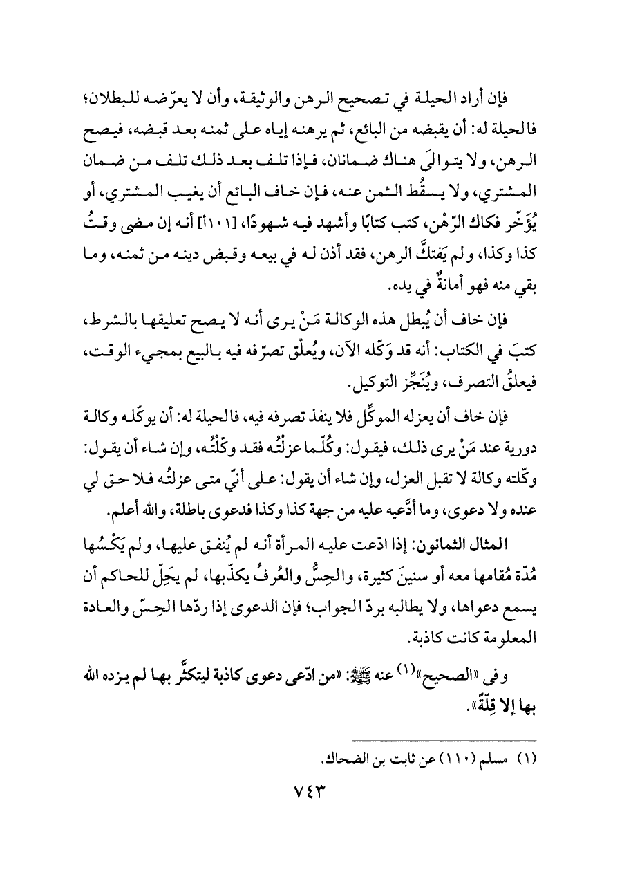 فإن أراد الحيلة في تصحيح الرهن والوثيقة، وأن لا يعرّضه للبطلان؛ فالحيلة له: أن يقبضه من البائع، ثم يرهنه إياه على ثمنه بعد قبضه، فيصح الرهن، ولا يتوالَى هناك ضمانان، فإذا تلف بعد ذلك تلف من ضمان المشتري، ولا يسقُط الثمن عنه، فإن خاف البائع أن يغيب المشتري، أو يُؤَخّر فكاك الرّهْن، كتب كتابًا وأشهد فيه شهودًا، [١٠١ أ] أنه إن مضى وقتُ كذا وكذا، ولم يَفتكَّ الرهن، فقد أذن له في بيعه وقبض دينه من ثمنه، وما بقي منه فهو أمانةٌ في يده.
