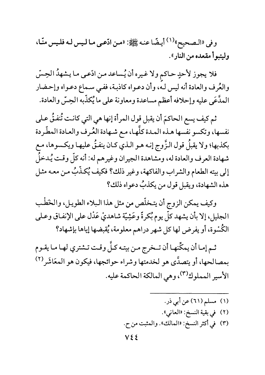 ثم كيف يسع الحاكمَ أن يقبل قول المرأة إنها هي التي كانت تُنفقُ على نفسها، وتكسو نفسها هذه المدة كلَّها، مع شهادة العُرف والعادة المطّردة بكذبها؛ ولا يقبلُ قول الزَّوج إنه هو الذي كان ينفقُ عليها ويكسوها، مع شهادة العرف والعادة له، ومشاهدة الجيران وغيرهم له: أنه كلّ وقت يُدخلُ إلى بيته الطعام والشراب والفاكهة، وغير ذلك؟ فكيف يُكذّبُ من معه مثل هذه الشهادة، ويقبل قول من يكذبُ دعواه ذلك؟