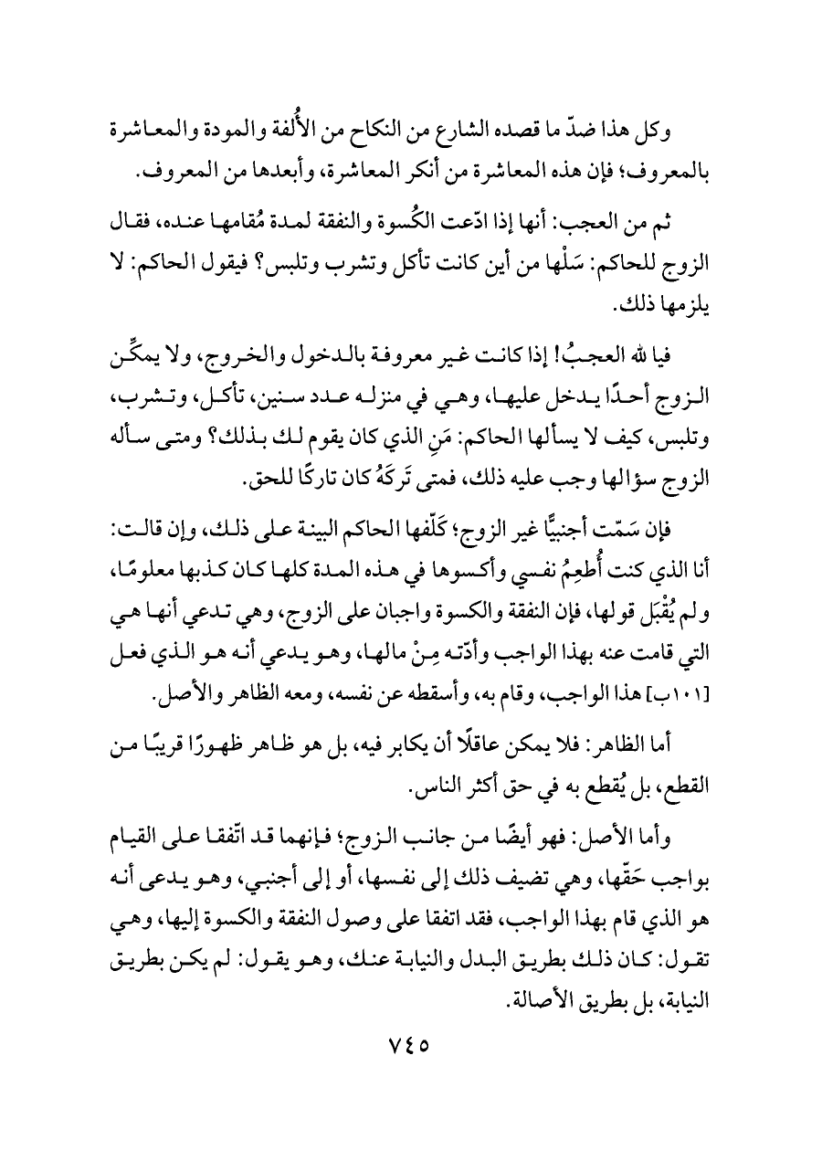 ثم من العجب: أنها إذا ادّعت الكُسوة والنفقة لمدة مُقامها عنده، فقال الزوج للحاكم: سَلْها من أين كانت تأكل وتشرب وتلبس؟ فيقول الحاكم: لا يلزمها ذلك.