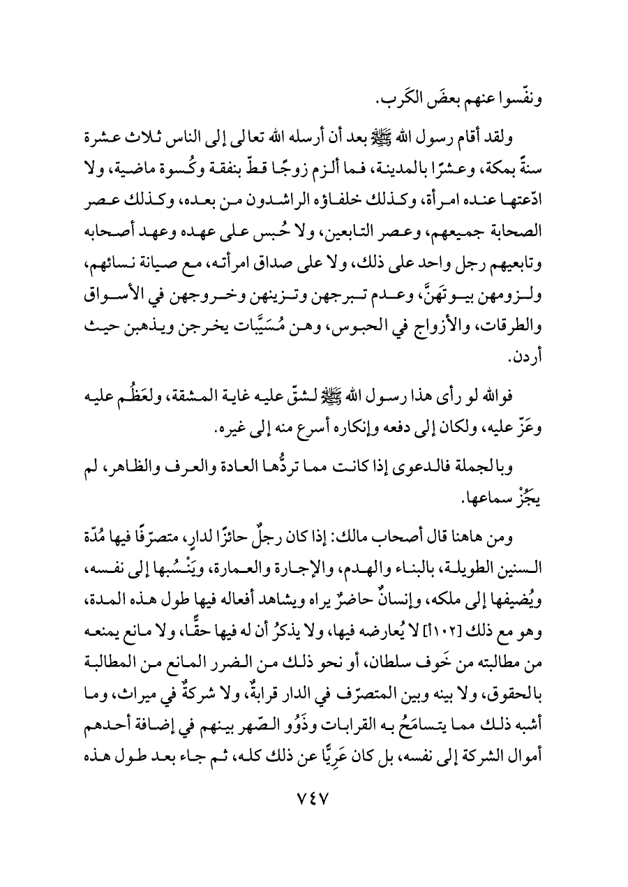 ولقد أقام رسول الله - صلى الله عليه وسلم - بعد أن أرسله الله تعالى إلى الناس ثلاث عشرة سنةً بمكة، وعشرًا بالمدينة، فما ألزم زوجًا قطّ بنفقة وكُسوة ماضية، ولا ادّعتها عنده امرأة، وكذلك خلفاؤه الراشدون من بعده، وكذلك عصر الصحابة جميعهم، وعصر التابعين، ولا حُبس على عهده وعهد أصحابه وتابعيهم رجل واحد على ذلك، ولا على صداق امرأته، مع صيانة نسائهم، ولزومهن بيوتَهنَّ، وعدم تبرجهن وتزينهن وخروجهن في الأسواق والطرقات، والأزواج في الحبوس، وهن مُسَيَّبات يخرجن ويذهبن حيث أردن.