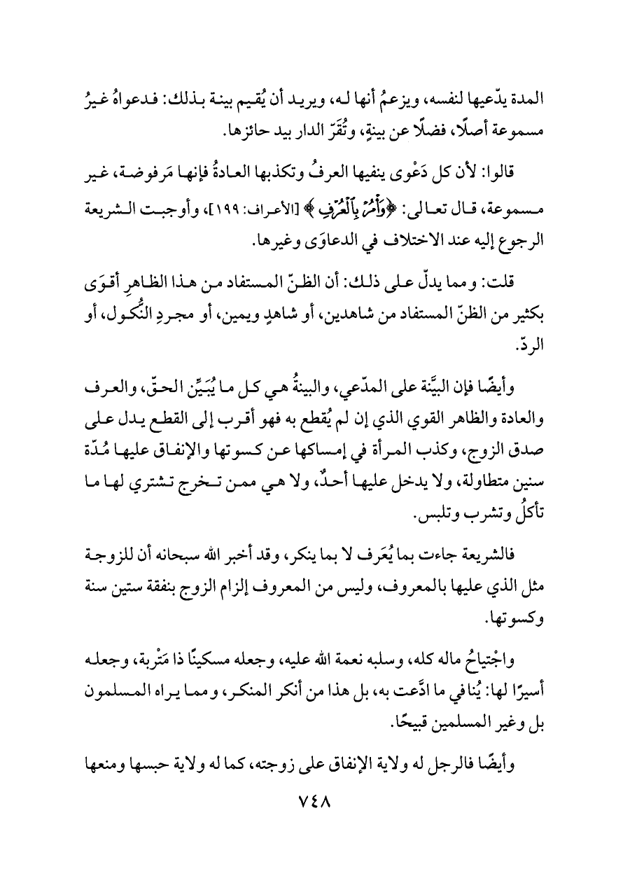 وأيضًا فإن البيَّنة على المدّعي، والبينةُ هي كل ما يُبَيِّن الحقّ، والعرف والعادة والظاهر القوي الذي إن لم يُقطع به فهو أقرب إلى القطع يدل على صدق الزوج، وكذب المرأة في إمساكها عن كسوتها والإنفاق عليها مُدّة سنين متطاولة، ولا يدخل عليها أحدٌ، ولا هي ممن تخرج تشتري لها ما تأكلُ وتشرب وتلبس.