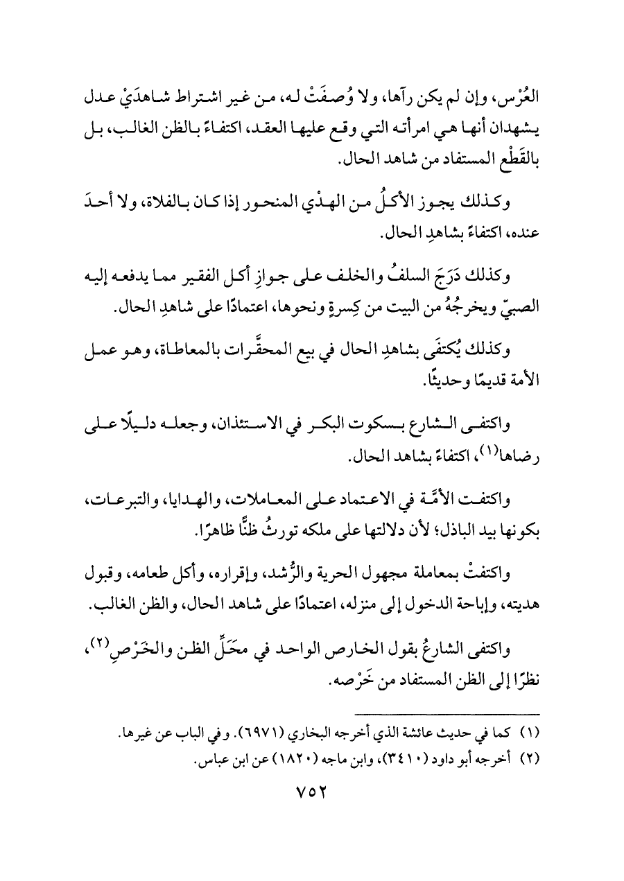 واكتفتْ بمعاملة مجهول الحرية والرُّشد، وإقراره، وأكل طعامه، وقبول هديته، وإباحة الدخول إلى منزله، اعتمادًا على شاهد الحال، والظن الغالب.