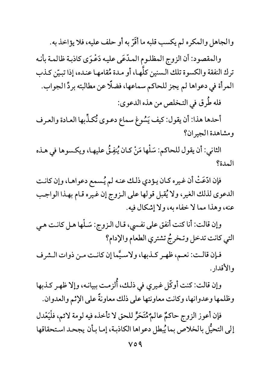 فإن أعوز الزوج حاكمٌ عالمٌ مُتَحَرٍّ للحق لا تأخذه فيه لومة لائم، فلْيَعْدل إلى التحيُّل بالخلاص بما يُبطل دعواها الكاذبة، إما بأن يجحد استحقاقها