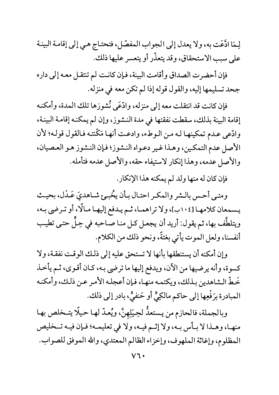 ومتى أحس بالشر والمكر احتال بأن يُخبئ شاهديَ عَدْل، بحيث يسمعان كلامها [١٠٤ ب]، ولا تراهما، ثم يدفع إليها مالًا، أو ترضى به، ويتلطَّف بها، ثم يقول: أريد أن يجعل كل منا صاحبه في حِلٍّ حتى تطيب أنفسنا، ولعل الموت يأتي بغتةً، ونحو ذلك من الكلام.