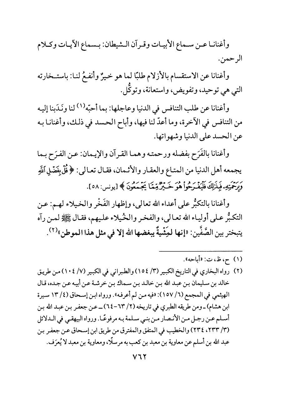 وأغنانا بالفَرَح بفضله ورحمته وهما القرآن والإيمان: عن الفرَح بما يجمعه أهل الدنيا من المتاع والعقار والأثمان، فقال تعالى: {قُلْ بِفَضْلِ اللَّهِ وَبِرَحْمَتِهِ فَبِذَلِكَ فَلْيَفْرَحُوا هُوَ خَيْرٌ مِمَّا يَجْمَعُونَ} [يونس: ٥٨].