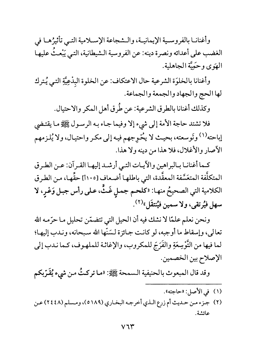 فلا تشتد حاجة الأمة إلى شيء إلا وفيما جاء به الرسول - صلى الله عليه وسلم - ما يقتضي إباحته (¬١) وتَوسعته، بحيث لا يُحْوِجهم فيه إلى مكر واحتيال، ولا يُلزمهم الآصار والأغلال، فلا هذا من دينه ولا هذا.