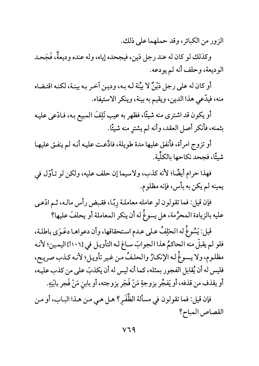 قيل: يَسُوغُ له الحَلِفُ على عدم استحقاقها، وأن دعواها دعَوَى باطلة، فلو لم يقبلْ منه الحاكمُ هذا الجوابَ ساغ له التأويل في [١٠٦ أ] اليمين؛ لأنه مظلوم، ولا يسوغُ له الإنكارُ والحلفُ من غير تأويل؛ لأنه كذب صريح، فليس له أن يُقابل الفجور بمثله، كما أنه ليس له أن يكذبَ على من كذب عليه، أو يقذف من قذفه، أو يَفجُر بزوجةِ مَنْ فَجَر بزوجته، أو بابنِ مَنْ فَجر بابْنِهِ.