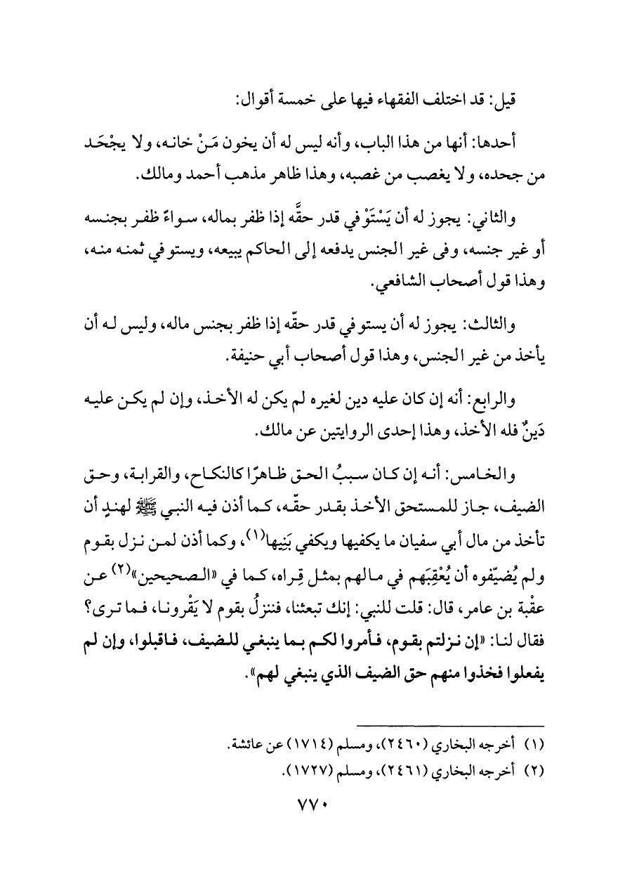 والخامس: أنه إن كان سببُ الحق ظاهرًا كالنكاح، والقرابة، وحق الضيف، جاز للمستحق الأخذ بقدر حقّه، كما أذن فيه النبي - صلى الله عليه وسلم - لهندٍ أن تأخذ من مال أبي سفيان ما يكفيها ويكفي بَنِيها (¬١)، وكما أذن لمن نزل بقوم ولم يُضيّفوه أن يُعْقِبَهم في مالهم بمثل قِراه، كما في «الصحيحين» (¬٢) عن عقْبة بن عامر، قال: قلت للنبي: إنك تبعثنا، فننزلُ بقوم لا يَقْرونا، فما ترى؟ فقال لنا: «إن نزلتم بقوم، فأمروا لكم بما ينبغي للضيف، فاقبلوا، وإن لم يفعلوا فخذوا منهم حق الضيف الذي ينبغي لهم».